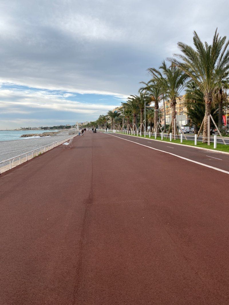 Ballade sympathique sur la promenade des Anglais à Nice. Vue imprenable sur la baie des anges. Parcs . Espèces végétales ( palmiers ). Nombreux bancs. Transports en commun.