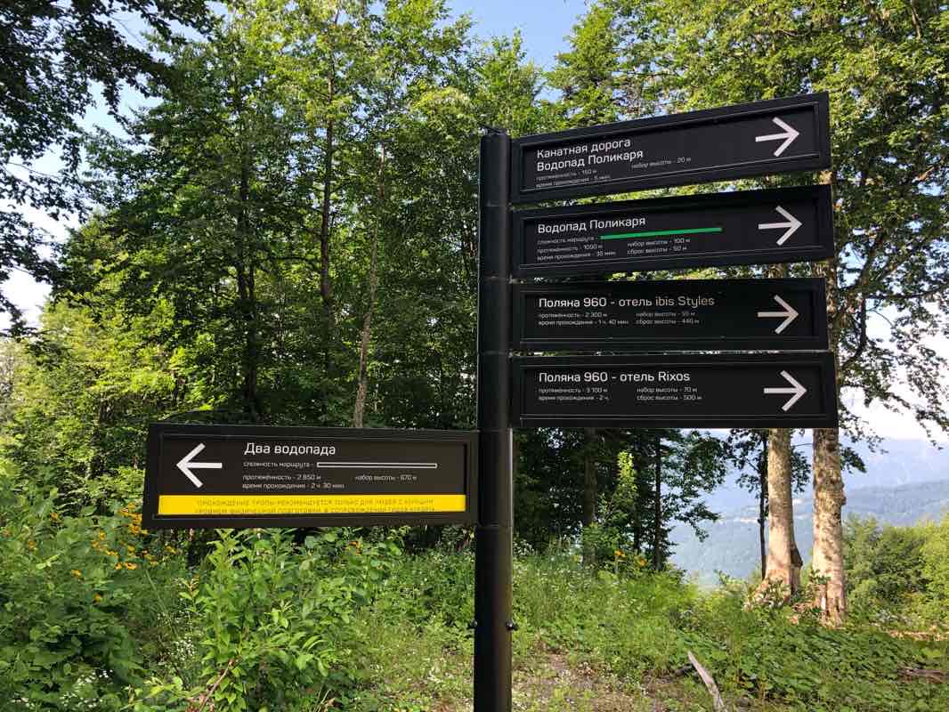 Пеший маршрут от вершины Чёрной пирамиды до водопада Поликаря. Сброс высоты 700м, от середины камни и крутой спуск. Общая протяженность 3,1-3,5 км. Для детей не рекомендуется, если проблемы с коленями - лучше не идти. Выход на креселку, которая привезёт на 960м. Название маршрута Два водопада - старт от водопада Медвежий, окончание - Поликаря.