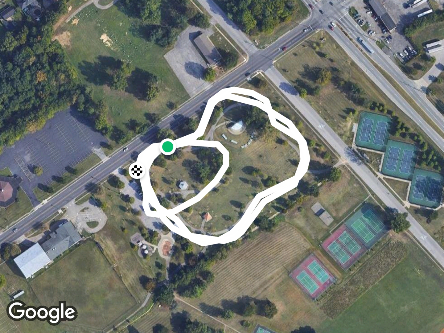 This track requires 3 1/2 laps to equal 1 mile however, it has shading and during the 5PM to 6PM hours the local church plays song bells.