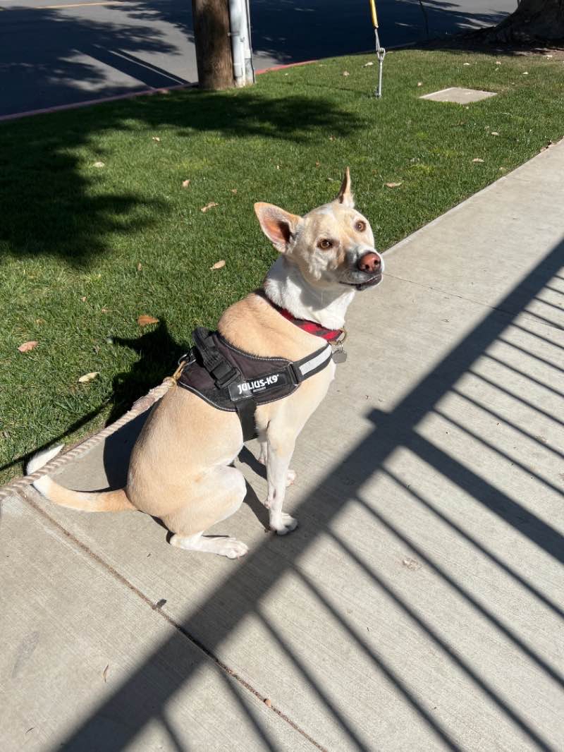 Chester came running, did the hello warmly, and got leashed up. Off we went down Pearl to the beach. He did well with checking out all the dogs being walked today. A couple of times he escaped to the gutter or edge and watched as the dog or person walked by. But mostly he actively walked and looked and continued on as usual. He had a lot of poop to let go of today. And he peed many times; the latter times were more marking actions. He is proud of himself when he gets into the right position and hits the tree on target. Back home, he has water but his priority was checking the house. He ran out back then ran upstairs as I left.