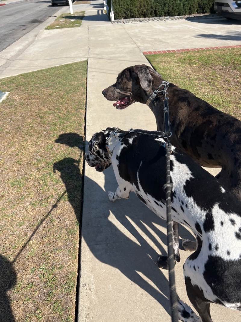 Today both Boulder and Denver walked together. We had fun surprising the people at the corner of 245th sitting on the sidewalk part of Burnin’ Daylight. Met a nice young boy waiting for his ride after school, I suppose. He was amazed by these two. We talked for a minute so he could see how nice these two are. And then an adult asked to see them, saying his uncle had a great Dane and that he has always admired his uncle's dog. They walked well, no issues. Bold pooped out a sloppy mess. It included a black mesh material. And he stopped to pee near the end of the walk.