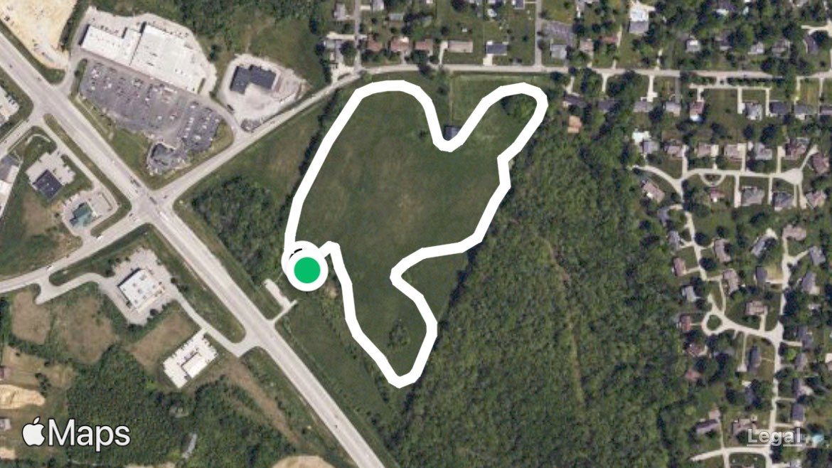 0.8 mile grass loop. Hills are gently sloped.