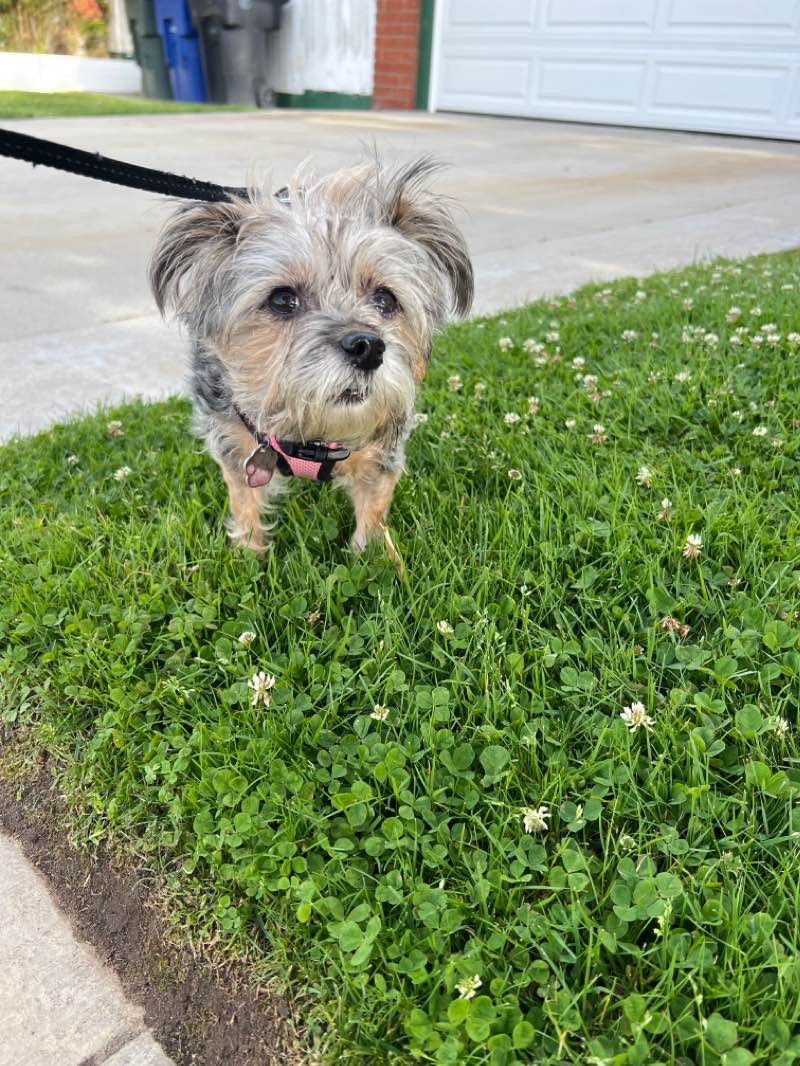 This afternoon I found Harlem up on the bed again. But this time I turned away and walked to the harness and leash. She hopped down, presumably the same way she climbed up, and ran to the couch and chair excited for the outing. She may have nibbled a bit on her food. The water looks the same as this morning. The pee pad is still unused. So she hoped to the floor (from the couch) to run to the door. And out we went. Right out front we met another little dog about Harlem's size. Light brown in color with a light mane, perked up ears and a pointed snout she was all happy to make an introduction. But Harlem was very standoffish. The little dog didn't want to meet me; she barked at me. But her tail was wagging friendly toward Harlem. And we went our separate ways. Harlem made a very small poop. And a few pee squats. She found a few places to sniff for interesting scents as we made our way along today's route. She was happy to get back home. This time she snuggled up to the arm of the couch and has snubbed the treat. Bit she did enjoy some petting.