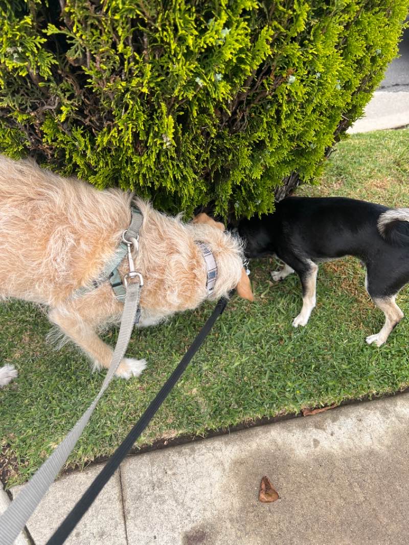 This morning the white car was in the driveway and Rex was out of his crate. Standing on his hind legs, he reached up to say “Hi” with a lot of excitement. We headed out to get Jon. They took off up Anza. Both stopped as usual to relieve themselves. Rex stopped to poop as usual. Later Jon stopped to poop. They continued their explorations as we walked the route. They did fine alternating the decisions on where to stop. Along Carson they stopped to poop again. Back home, both ran to their dens. Jon got a treat and a “goodbye”. Rex had to check for Aaron first, then he went to his crate. He got a treat as well.