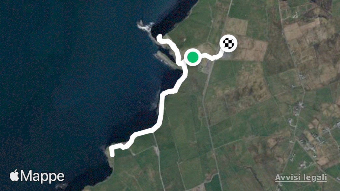 The Cliffs of Moher (; Irish: Aillte an Mhothair) are sea cliffs located at the southwestern edge of the Burren region in County Clare, Ireland. They run for about 14 kilometres (9 miles). At their southern end, they rise 120 metres (390 ft) above the Atlantic Ocean at Hag's Head, and, 8 kilometres (5 miles) to the north, they reach their maximum height of 214 metres (702 ft) just north of O'Brien's Tower, a round stone tower near the midpoint of the cliffs, built in 1835 by Sir Cornelius O'Brien, then continue at lower heights.