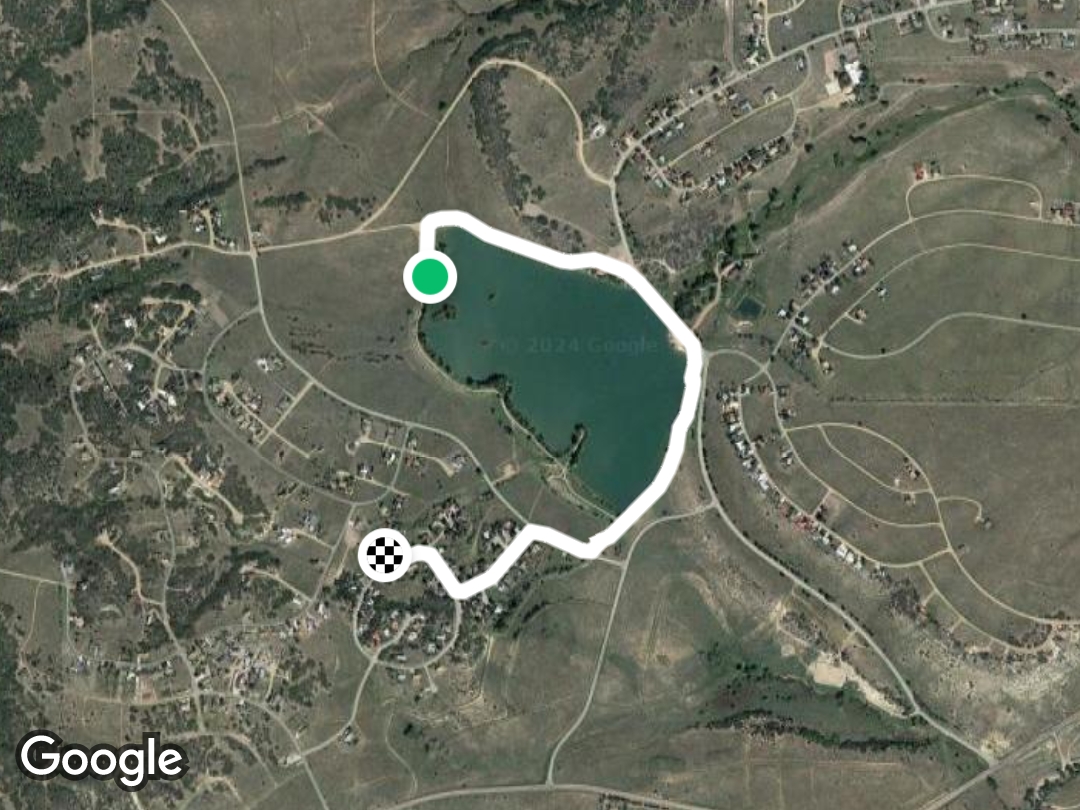 1.4 miles is all the way around a beautiful lake. The path is partially paved but broken in many spots. Lots of shade, picnic and non-gas powered boating. A view of Greenhorn Mountain and the plains are a plus to a peaceful walk or jog.