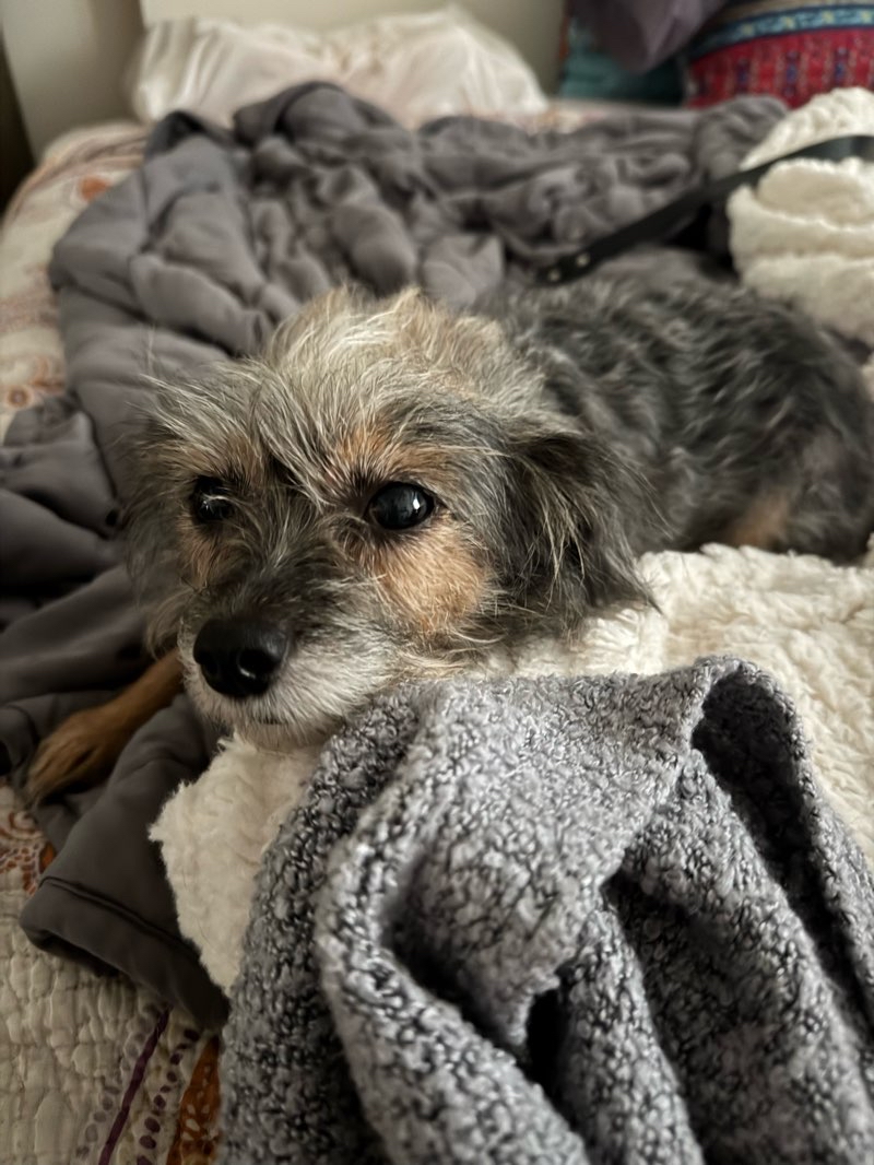 Harlem was quiet when I came inside. She was found snuggled in the bed. I think she remembered me because she didn’t bark and she let me pet her. She didn’t want to move so I left her there and headed back to fill her food and water bowls. When she saw her leash and collar she got up and, with tail wagging, let me put it on her. She hopped down her steps and we headed out the door. There were scents to sniff as soon as the bottom of the stairs. Harlem was very busy sniffing the treebank along Garnet. She quickly squatted to pee many times and she pooped a couple of times. She finished the loop around the block with more sniffing all the way. Back home, she hopped up on the couch, enjoying more petting for a while. She got on the blanket and munched on a small biscuit treat. TV is running so I didn’t touch it. Good company for her.