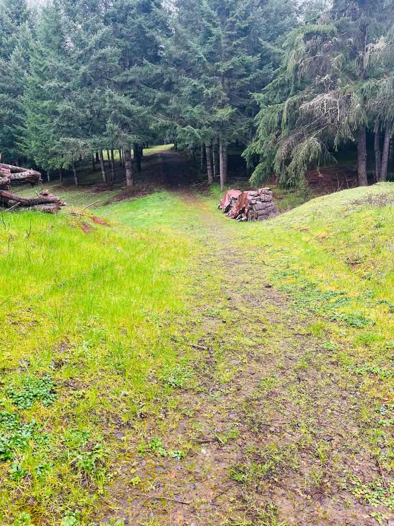 Private Property. Trail starts on the west side of the house at the fence, across the parking lot, behind the shop, out the access road to the forest, around the loop and back again! Be Careful of uneven ground and note the elevation change for light hill work!