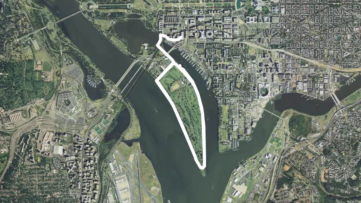 East Potomac Park is a park located on a man-made island in the Potomac River in Washington, D.C., in the United States. The park lies southeast of the Jefferson Memorial and the 14th Street Bridge, and the park lies between the Washington Channel and the Potomac River. Amenities in East Potomac Park include the East Potomac Park Golf Course, a miniature golf course, a public swimming pool (the East Potomac Park Aquatic Center), tennis courts, and several athletic fields (some configured for baseball and softball, others for soccer, rugby, or American football).