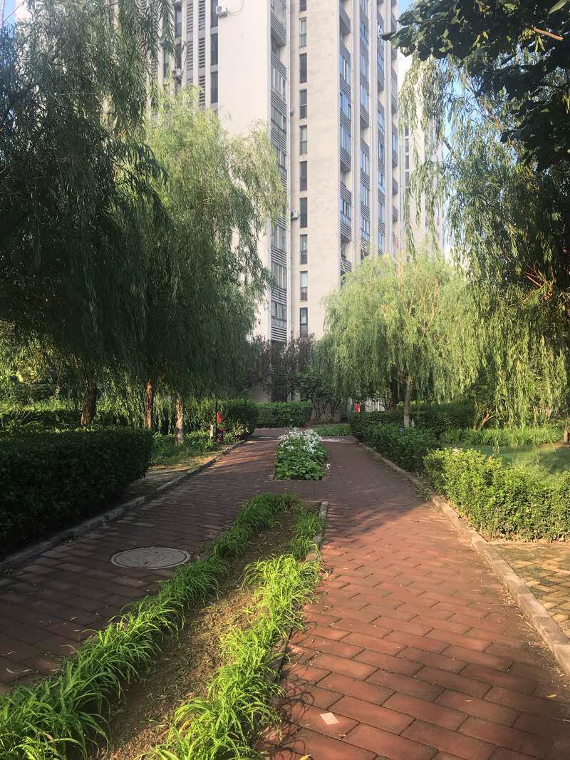 小区健身步道,身边是绿色的植物